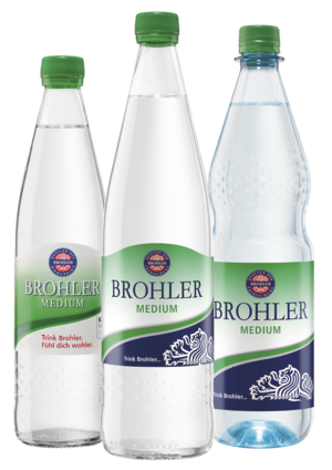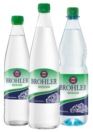 Brohler Medium: Ideal für alle, die den abgerundeten Geschmack von Brohler Mineralwasser mit weniger Kohlensäure genießen möchten. Überzeugend auch hier: Die hohe Gesamt-Mineralisation wie auch der Reichtum an Magnesium und Hydrogencarbonat.
